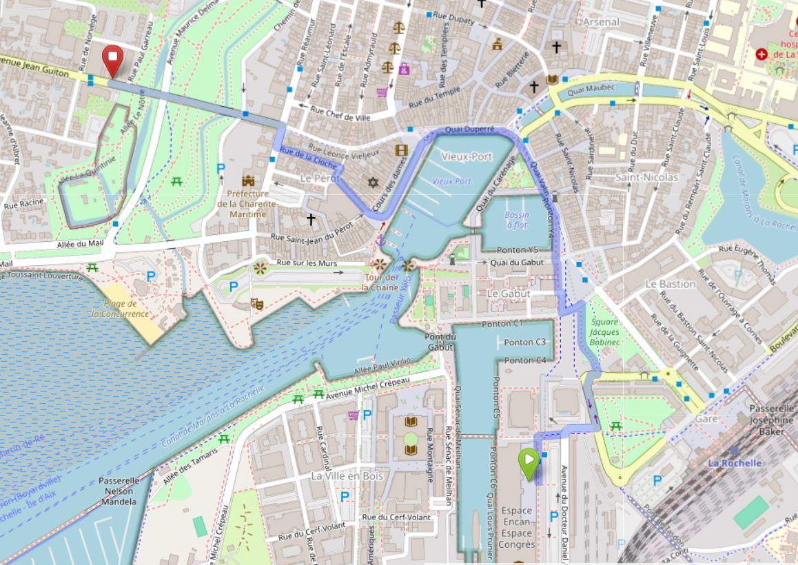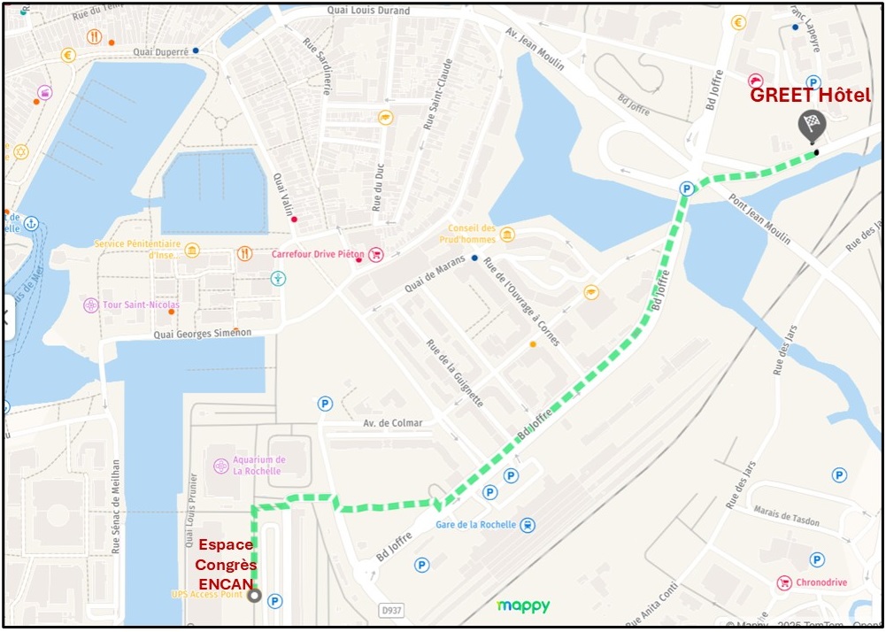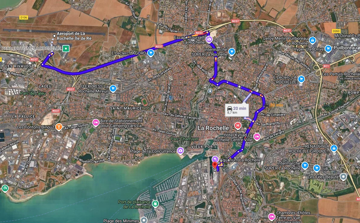 Aéroport La Rochelle–Île de Ré : via N237 (Rocade Rochelaise), puis sortie Centre Ville, Av. du 11 Novembre 1918, carrefour de Fétilly, carrefour de la Porte Royale, Av. Cognehors, Boulevard Joffre vers Gare, avenue du 123ème RI et parking Encan 1.
