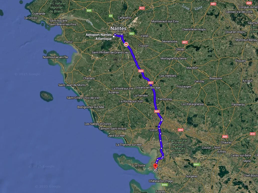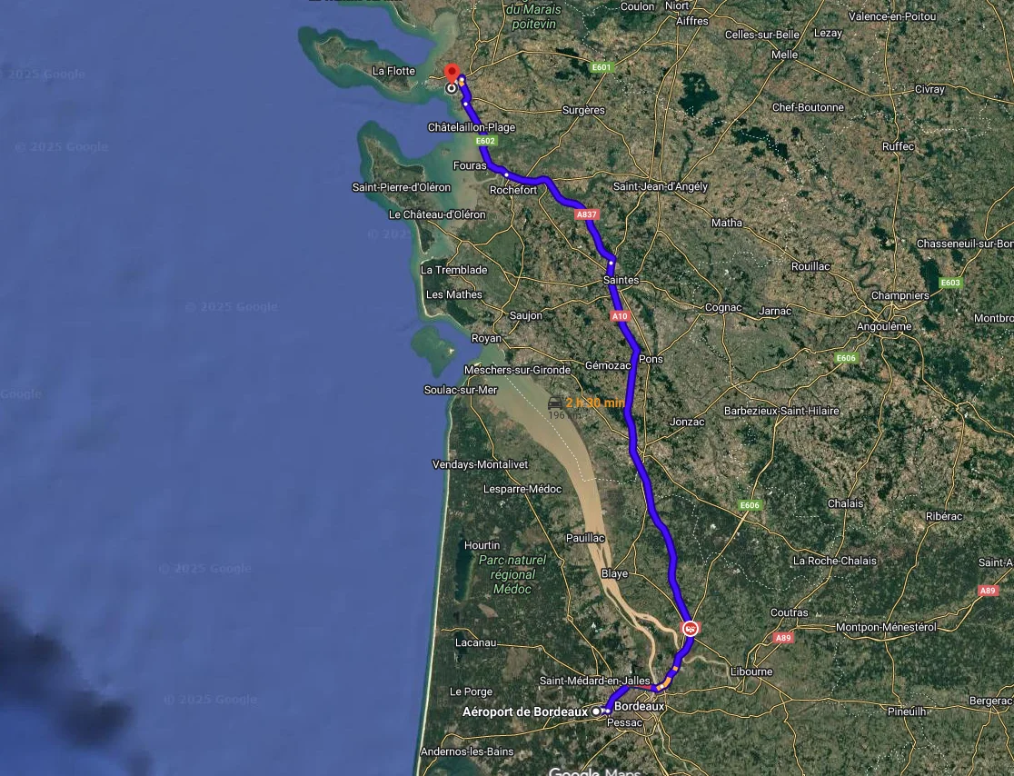 Cela implique un transfert véhiculé de Bordeaux à La Rochelle, ou le passage par la gare SNCF de Bordeaux :