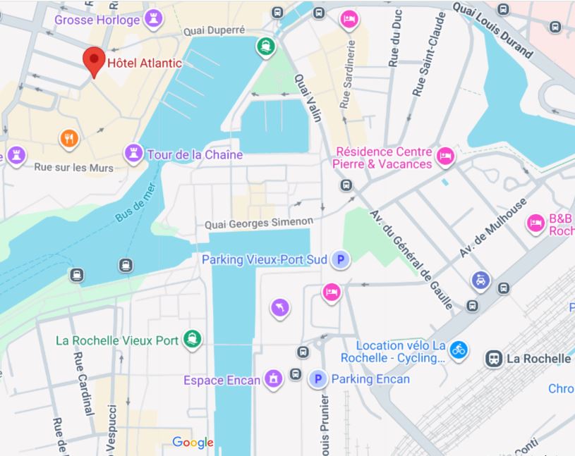 L’Hôtel Atlantic se situe dans le centre de La Rochelle, dans le quartier du Pérot, à 50m du cours des Dames du vieux port, à 900 m de l’Espace ENCAN (Congrès CDF), à 1,2 km de la gare SNCF (15 minutes de marche), en parcourant agréablement le Vieux Port à pied.