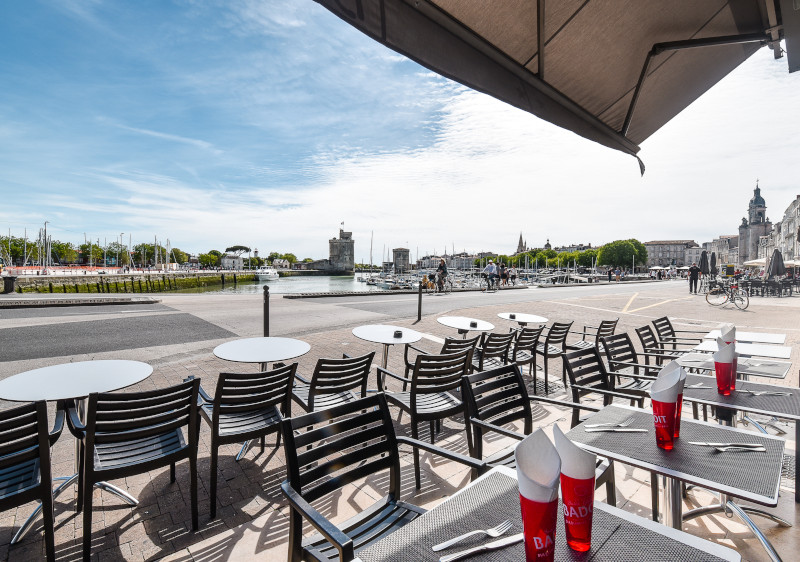 Au rez-de-chaussée de l’hôtel, la brasserie étend sa terrasse matin, midi et soir, sur le port.